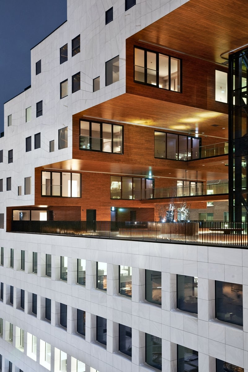 Esta emblemática terraza forma una barrera física entre el espacio de oficinas de abajo y los apartamentos residenciales de arriba. Los paneles NATURCLAD-W que revisten el techo bajo cubierta de la terraza y la fachada escalonada en el exterior acentúan el contraste entre los espacios. Proporcionan una sensación de calidez y naturalidad, además de aislar el edificio de las bajas temperaturas de la ciudad de Oslo.